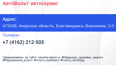 АвтоВольт, автосервис по адресу 675028, Амурская область, Благовещенск, Воронкова, 5/1 в дальнейшем Организация, размещена в следующих категориях: