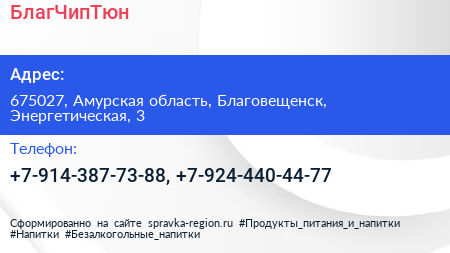 БлагЧипТюн по адресу 675027, Амурская область, Благовещенск, Энергетическая, 3 в дальнейшем Организация, размещена в следующих категориях: