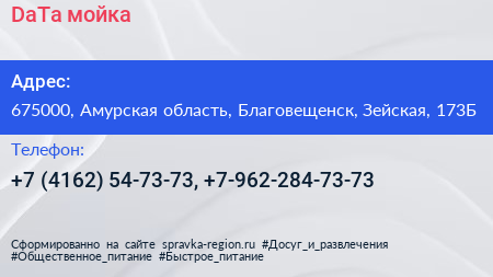 DaTa-мойка по адресу 675000, Амурская область, Благовещенск, Зейская, 173Б в дальнейшем Организация, размещена в следующих категориях: