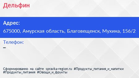 Дельфин по адресу 675000, Амурская область, Благовещенск, Мухина, 156/2 в дальнейшем Организация, размещена в следующих категориях: