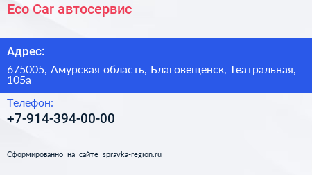 Eco Car, автосервис по адресу 675005, Амурская область, Благовещенск, Театральная, 105а в дальнейшем Организация, размещена в следующих категориях: