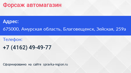 Форсаж, автомагазин по адресу 675000, Амурская область, Благовещенск, Зейская, 259а в дальнейшем Организация, размещена в следующих категориях: