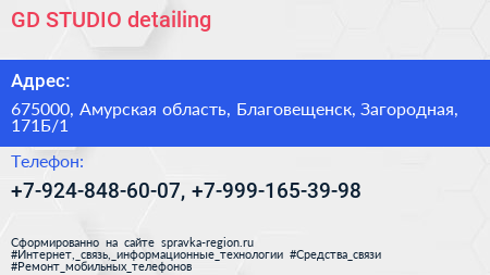 GD STUDIO detailing по адресу 675000, Амурская область, Благовещенск, Загородная, 171Б/1 в дальнейшем Организация, размещена в следующих категориях: