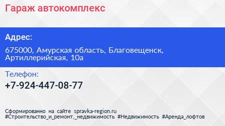 Гараж, автокомплекс по адресу 675000, Амурская область, Благовещенск, Артиллерийская, 10а в дальнейшем Организация, размещена в следующих категориях: