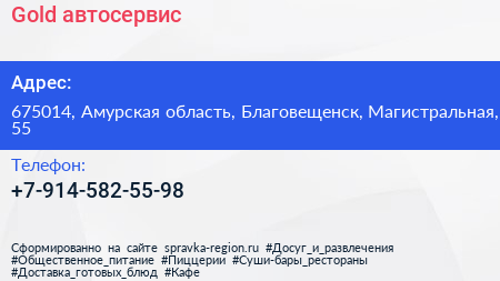Gold, автосервис по адресу 675014, Амурская область, Благовещенск, Магистральная, 55 в дальнейшем Организация, размещена в следующих категориях: