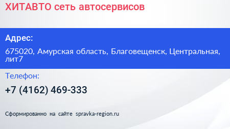 ХИТАВТО, сеть автосервисов по адресу 675020, Амурская область, Благовещенск, Центральная, лит7 в дальнейшем Организация, размещена в следующих категориях:
