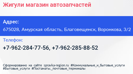 Жигули, магазин автозапчастей по адресу 675028, Амурская область, Благовещенск, Воронкова, 3/2 в дальнейшем Организация, размещена в следующих категориях: