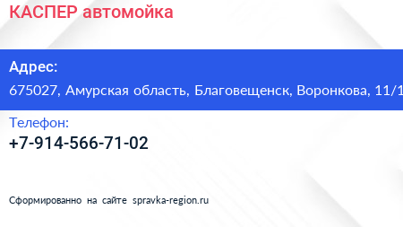 КАСПЕР, автомойка по адресу 675027, Амурская область, Благовещенск, Воронкова, 11/1 в дальнейшем Организация, размещена в следующих категориях: