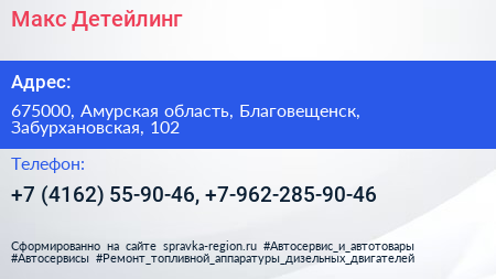 Макс Детейлинг по адресу 675000, Амурская область, Благовещенск, Забурхановская, 102 в дальнейшем Организация, размещена в следующих категориях: