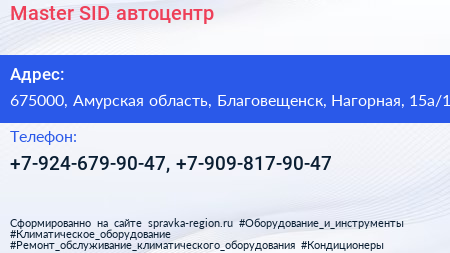 Master SID, автоцентр по адресу 675000, Амурская область, Благовещенск, Нагорная, 15а/1 в дальнейшем Организация, размещена в следующих категориях:
