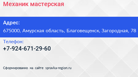 Механик, мастерская по адресу 675000, Амурская область, Благовещенск, Загородная, 78 в дальнейшем Организация, размещена в следующих категориях: