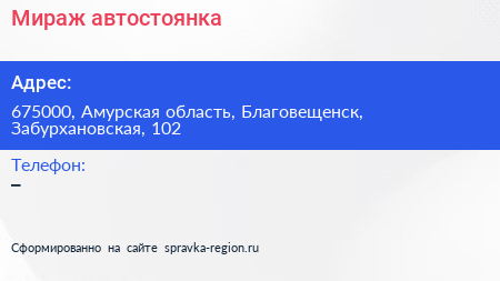 Мираж, автостоянка по адресу 675000, Амурская область, Благовещенск, Забурхановская, 102 в дальнейшем Организация, размещена в следующих категориях: