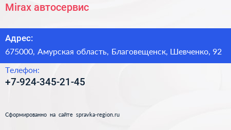 Mirax, автосервис по адресу 675000, Амурская область, Благовещенск, Шевченко, 92 в дальнейшем Организация, размещена в следующих категориях: