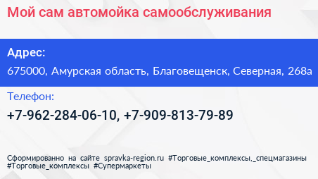 Мой сам, автомойка самообслуживания по адресу 675000, Амурская область, Благовещенск, Северная, 268а в дальнейшем Организация, размещена в следующих категориях: