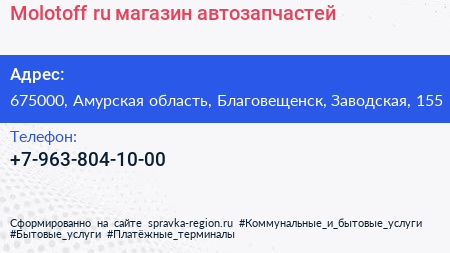 Molotoff.ru, магазин автозапчастей по адресу 675000, Амурская область, Благовещенск, Заводская, 155 в дальнейшем Организация, размещена в следующих категориях: