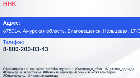 ННК по адресу 675014, Амурская область, Благовещенск, Кольцевая, 17/3 в дальнейшем Организация, размещена в следующих категориях:
