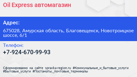 Oil-Express, автомагазин по адресу 675028, Амурская область, Благовещенск, Новотроицкое шоссе, 6/1 в дальнейшем Организация, размещена в следующих категориях: