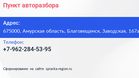 Пункт авторазбора по адресу 675000, Амурская область, Благовещенск, Заводская, 167а в дальнейшем Организация, размещена в следующих категориях: