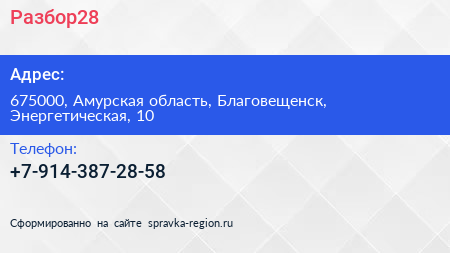 Разбор28 по адресу 675000, Амурская область, Благовещенск, Энергетическая, 10 в дальнейшем Организация, размещена в следующих категориях: