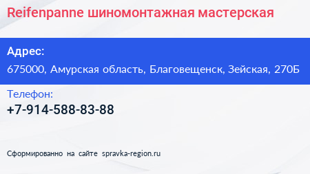 Reifenpanne, шиномонтажная мастерская по адресу 675000, Амурская область, Благовещенск, Зейская, 270Б в дальнейшем Организация, размещена в следующих категориях: