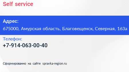 Self service по адресу 675000, Амурская область, Благовещенск, Северная, 163а в дальнейшем Организация, размещена в следующих категориях: