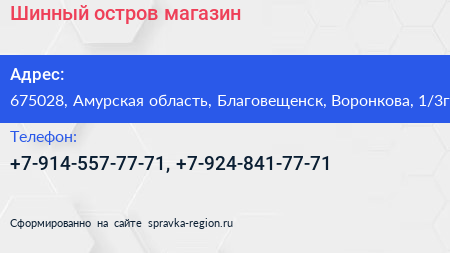 Шинный остров, магазин по адресу 675028, Амурская область, Благовещенск, Воронкова, 1/3г в дальнейшем Организация, размещена в следующих категориях: