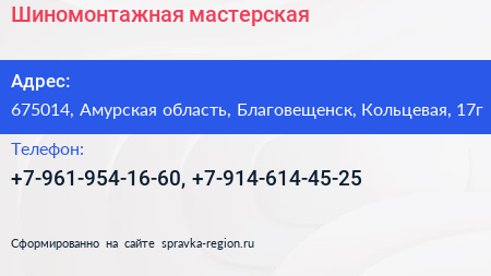 Шиномонтажная мастерская по адресу 675014, Амурская область, Благовещенск, Кольцевая, 17г в дальнейшем Организация, размещена в следующих категориях: