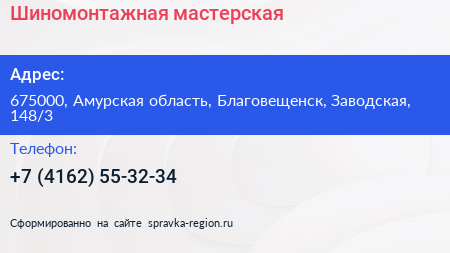 Шиномонтажная мастерская по адресу 675000, Амурская область, Благовещенск, Заводская, 148/3 в дальнейшем Организация, размещена в следующих категориях: