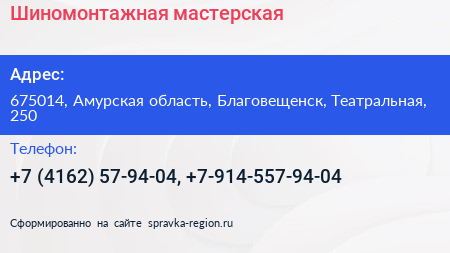 Шиномонтажная мастерская по адресу 675014, Амурская область, Благовещенск, Театральная, 250 в дальнейшем Организация, размещена в следующих категориях: