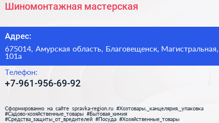 Шиномонтажная мастерская по адресу 675014, Амурская область, Благовещенск, Магистральная, 101а в дальнейшем Организация, размещена в следующих категориях: