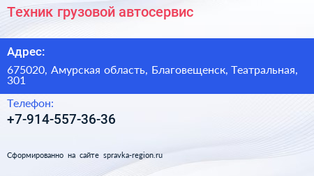 Техник, грузовой автосервис по адресу 675020, Амурская область, Благовещенск, Театральная, 301 в дальнейшем Организация, размещена в следующих категориях: