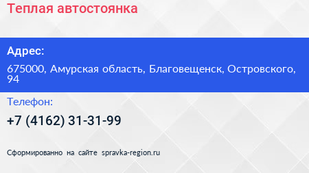 Теплая автостоянка по адресу 675000, Амурская область, Благовещенск, Островского, 94 в дальнейшем Организация, размещена в следующих категориях: