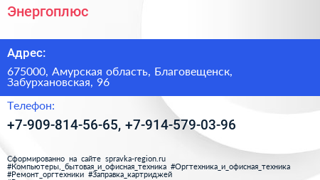Энергоплюс по адресу 675000, Амурская область, Благовещенск, Забурхановская, 96 в дальнейшем Организация, размещена в следующих категориях: