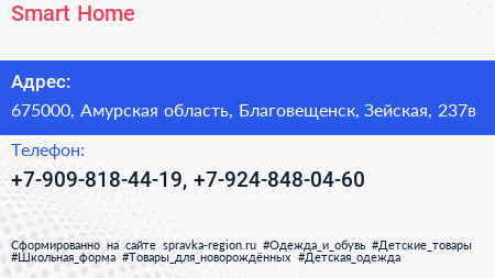 Smart Home+ по адресу 675000, Амурская область, Благовещенск, Зейская, 237в в дальнейшем Организация, размещена в следующих категориях: