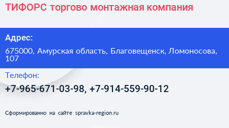 ТИФОРС, торгово- монтажная компания по адресу 675000, Амурская область, Благовещенск, Ломоносова, 107 в дальнейшем Организация, размещена в следующих категориях: