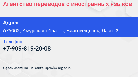 Агентство переводов с иностранных языков по адресу 675002, Амурская область, Благовещенск, Лазо, 2 в дальнейшем Организация, размещена в следующих категориях: