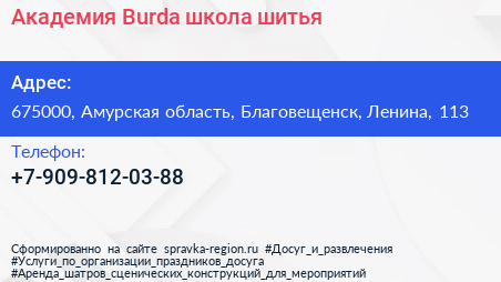 Академия Burda, школа шитья по адресу 675000, Амурская область, Благовещенск, Ленина, 113 в дальнейшем Организация, размещена в следующих категориях:
