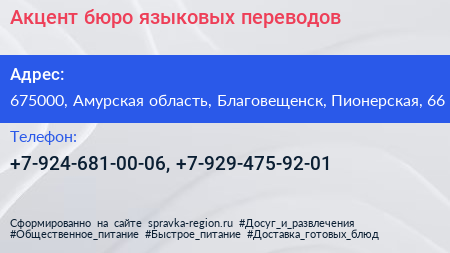 Акцент, бюро языковых переводов по адресу 675000, Амурская область, Благовещенск, Пионерская, 66 в дальнейшем Организация, размещена в следующих категориях: