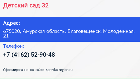 Детский сад №32 по адресу 675020, Амурская область, Благовещенск, Молодёжная, 21 в дальнейшем Организация, размещена в следующих категориях: