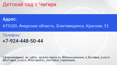 Детский сад, с. Чигири по адресу 675520, Амурская область, Благовещенск, Красная, 11 в дальнейшем Организация, размещена в следующих категориях:
