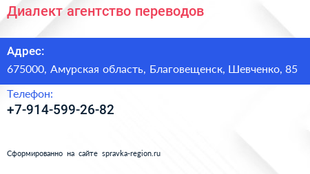 Диалект, агентство переводов по адресу 675000, Амурская область, Благовещенск, Шевченко, 85 в дальнейшем Организация, размещена в следующих категориях: