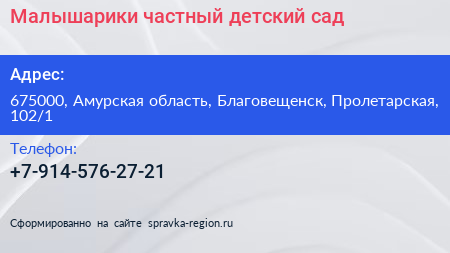 Малышарики, частный детский сад по адресу 675000, Амурская область, Благовещенск, Пролетарская, 102/1 в дальнейшем Организация, размещена в следующих категориях: