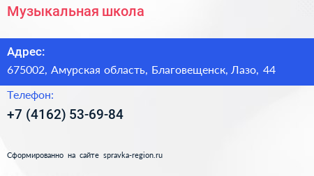 Музыкальная школа по адресу 675002, Амурская область, Благовещенск, Лазо, 44 в дальнейшем Организация, размещена в следующих категориях: