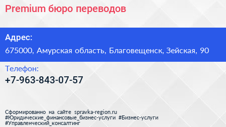 Premium, бюро переводов по адресу 675000, Амурская область, Благовещенск, Зейская, 90 в дальнейшем Организация, размещена в следующих категориях: