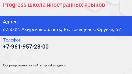 Progress, школа иностранных языков по адресу 675002, Амурская область, Благовещенск, Фрунзе, 57 в дальнейшем Организация, размещена в следующих категориях: