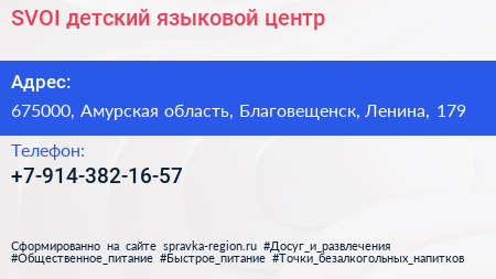 SVOI, детский языковой центр по адресу 675000, Амурская область, Благовещенск, Ленина, 179 в дальнейшем Организация, размещена в следующих категориях:
