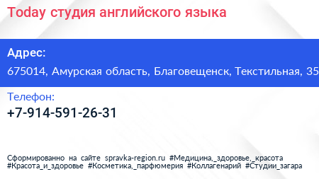 Today!, студия английского языка по адресу 675014, Амурская область, Благовещенск, Текстильная, 35 в дальнейшем Организация, размещена в следующих категориях: