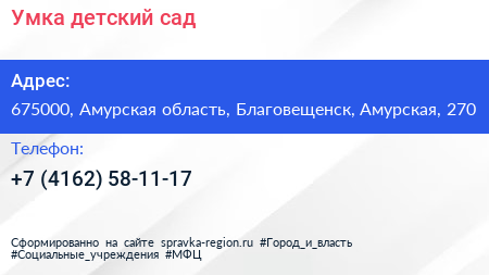 Умка, детский сад по адресу 675000, Амурская область, Благовещенск, Амурская, 270 в дальнейшем Организация, размещена в следующих категориях: