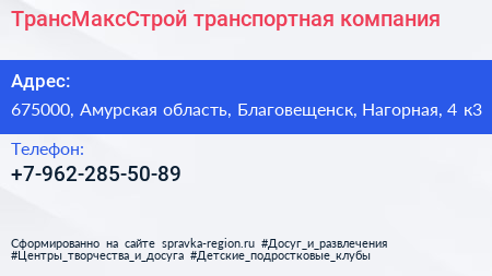 ТрансМаксСтрой, транспортная компания по адресу 675000, Амурская область, Благовещенск, Нагорная, 4 к3 в дальнейшем Организация, размещена в следующих категориях: