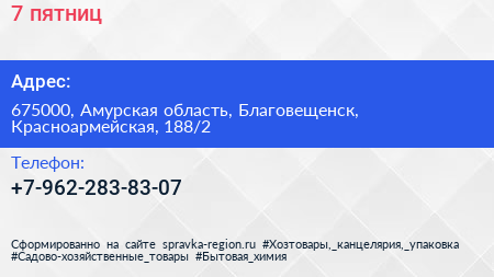7 пятниц по адресу 675000, Амурская область, Благовещенск, Красноармейская, 188/2 в дальнейшем Организация, размещена в следующих категориях:
